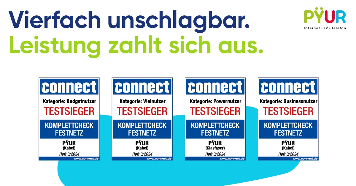 In der connect Ausgabe 3/2024 treten die Tarife von PŸUR in vier Leistungsklassen an und werden auch viermal als Testsieger bei den regionalen Anbietern ausgezeichnet. Sowohl in den Tarifkategorien für Budgetnutzer (ab 50 Mbit/s) und Vielnutzer (ab 200 Mbit/s) als auch für Powernutzer (400-500 Mbit/s) und Businessnutzer (bis 1 Gbit/s) schnürt PŸUR das beste Gesamtpaket.